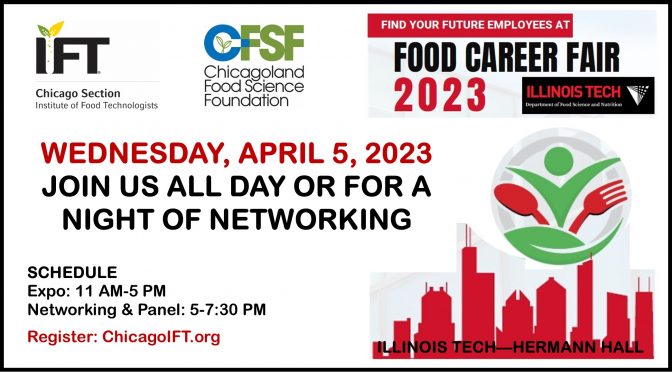 The Department of Food Science and Nutrition (FDSN) at Illinois Tech is excited to announce our partnership with BSI, Chicagoland Food & Beverage Network (CFBN), Chicago Section IFT (CSIFT), Food Processing Suppliers Association (FPSA), and the Institute for Food Safety and Health (IFSH) as we host Illinois Tech’s first food focused Career Fair this Spring.